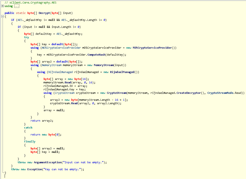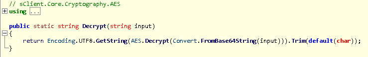 We proceed to sClient.Config/Settings to find what looks like various Base64-encoded strings and an initialise function. Perfect. It looks to be following a similar process to decrypt the strings within this file; however, the way the encryption key is created looks slightly different to how it was created in the original source code.