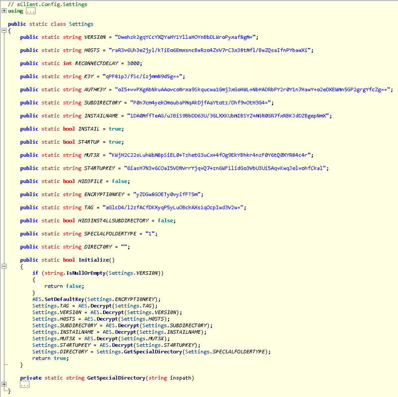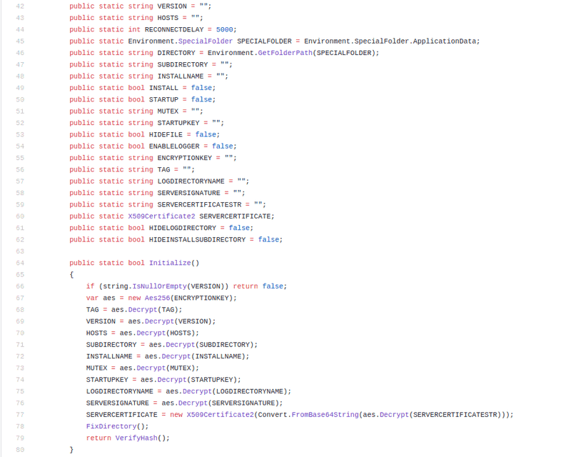 As you can see, the C# coded RAT initialises each field within this file by calling a function within the class AES - aes.Decrypt.