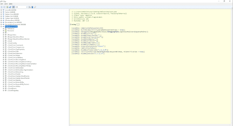 As we know the RAT is coded in C#, we can open the sample inside ILSpy, a .net decompiler that will bring the Windows executable back to its original source code. So far, so good.
