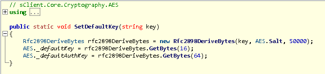 We click on the SetDefaultKey function, which is called with the encryption key as a parameter; the function seems to be deriving an auth key of 64 bytes and a default key of 16 bytes (looks like a key for AES) from the rfc2898derivebytes function, which is a PBKDF2 implementation that basically hashes a password and salt a specified number of times.