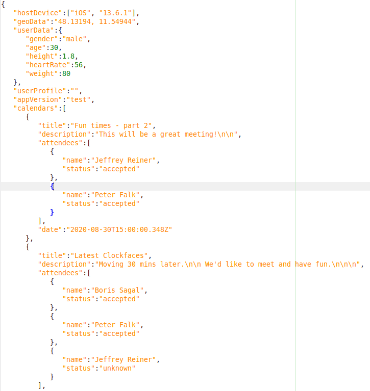 Essentially, it could send device type, location, and user information including gender, age, height, heart rate and weight. It could also access calendar information. While this doesn’t include PII profile data, the calendar invites could expose additional information such as names and locations.