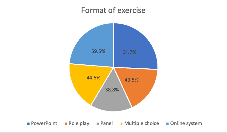 It is not just the frequency of exercises that would benefit from an update. According to respondents, the techniques used for delivering scenarios also leave much to be desired considering the most common format is PowerPoint (65%). A static classroom-based approach like this will do little to engage participants and improve information retention.